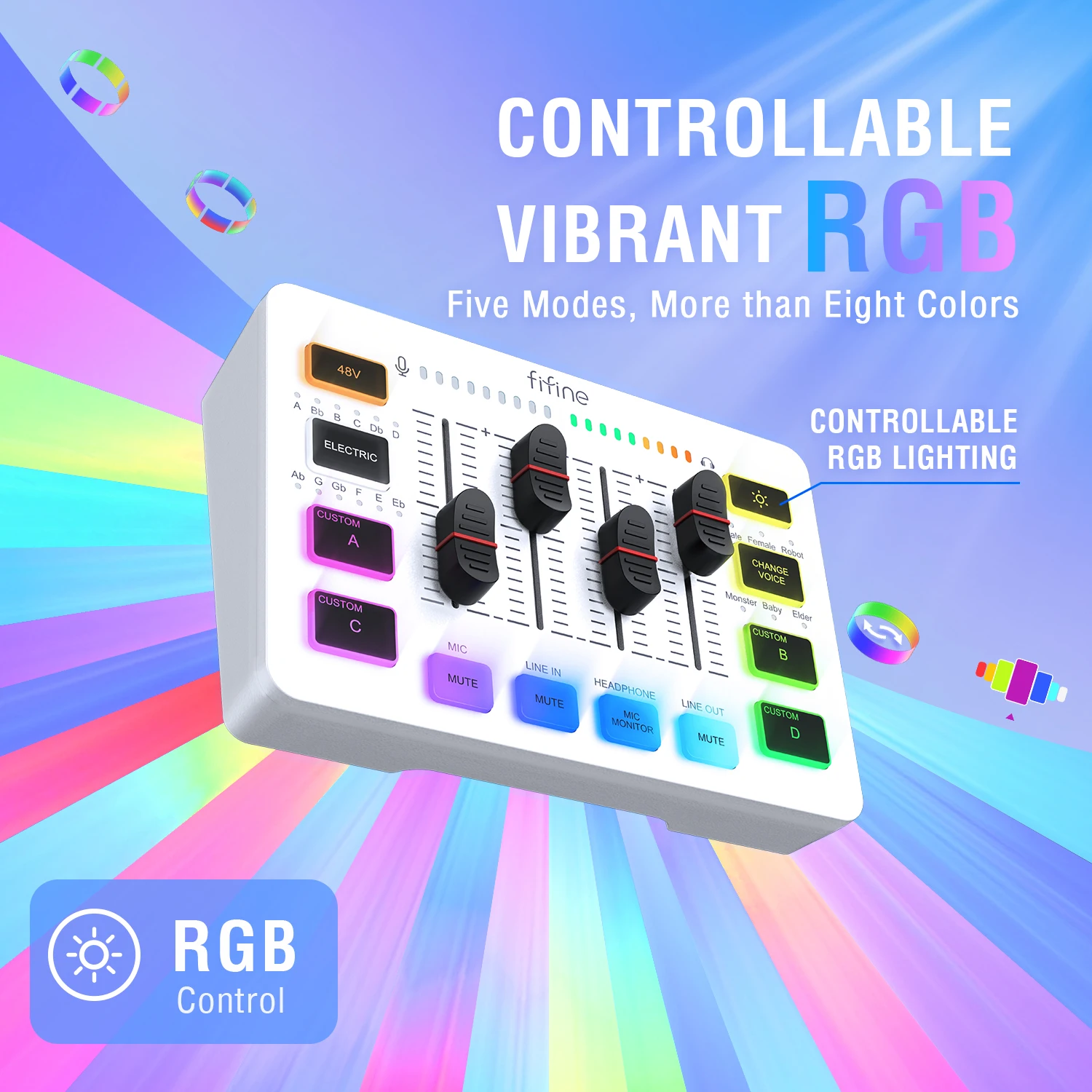 Ultra-convenient ControlsWith 4 independent channels and push-fader volume control, this audio mixer lets you achieve the perfect sound volume effortlessly. Thanks to the mute button, you can also mute the input and output volumes with a single click when you needed.Note: XLR cable is not included.Enjoy High-quality RecordingsThe SC3W offers multiple audio interfaces, you can easily upgrade the audio quality with the XLR connector. Enjoy the convenience of built-in 48V phantom power, allowing you to use your condenser mic directly without the need for an extra power supply.Make Your Recordings More InteractiveWith 6 voice-changing effects allowing you to change your voice from robotic to childlike with a single click. You can also customise the recording settings such as laughing and clapping to enhance the interactive atmosphere. Convert and gain more sound tones that unleash your creativity.Impeccably Stunning VisualsThe RGB buttons on the audio mixer cater for different live themes. Adjustable RGB lighting effects create the perfect visual atmosphere to add a touch of excitement to your channels.Powerful Multi-scenario ApplicabilityWith the powerful compatibility of SC3W, you can use it in a variety of scenarios such as live gaming, Liveshow, recording and streaming.