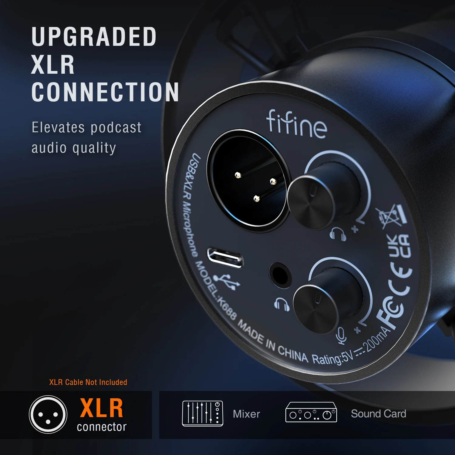 Enhanced Sound QualityExperience superior sound quality with the K688 featuring a premium moving-coil microphone core designed to deliver exceptional detail and crisp vocals across an impressive frequency response range (70Hz-15KHz) and a maximum SPL of 130dB. Whether you’re recording videos, audio, or hosting live broadcasts, this microphone ensures rich and natural audio output every time.Advanced Noise ReductionSay goodbye to unwanted background noise with the K688’s external shock mount and windscreen that effectively eliminate low-frequency vibrations and mechanical disturbances. This microphone ensures a clean recording environment, preventing harsh sounds and delivering professional-grade audio results.Professional ConnectivityEquipped with an XLR connector, the K688 seamlessly integrates with professional audio equipment, eliminating the need for an additional in-line preamplifier. This connection enriches vocal resonance, adds depth, and minimizes unwanted circuit noise interference, guaranteeing a premium recording experience with enhanced audio clarity. Note: XLR cables are not includedEffortless USB DesignSimplify your recording setup with the K688’s convenient USB interface. Enjoy plug-and-play functionality without the hassle of driver installations. This microphone is compatible with PCs, laptops, and PS4/PS5 consoles, making it ideal for everyday recording needs with seamless connectivity.User-Friendly FeaturesThe K688 offers a touch mute button with an LED indicator, allowing you to easily control the microphone status at a glance. Adjust the volume effortlessly with the gain knob and take advantage of the monitoring function through the 3.5mm headphone jack for real-time audio feedback. Stay in control and elevate your recording experience with the versatile K688 USB microphone.